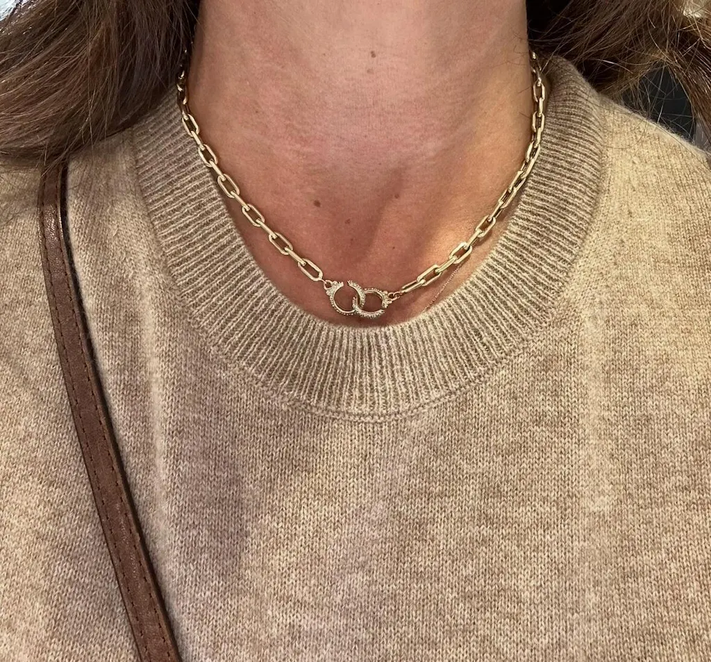 14k Gold Large Open Link Chain with Diamond Handcuffs Necklace