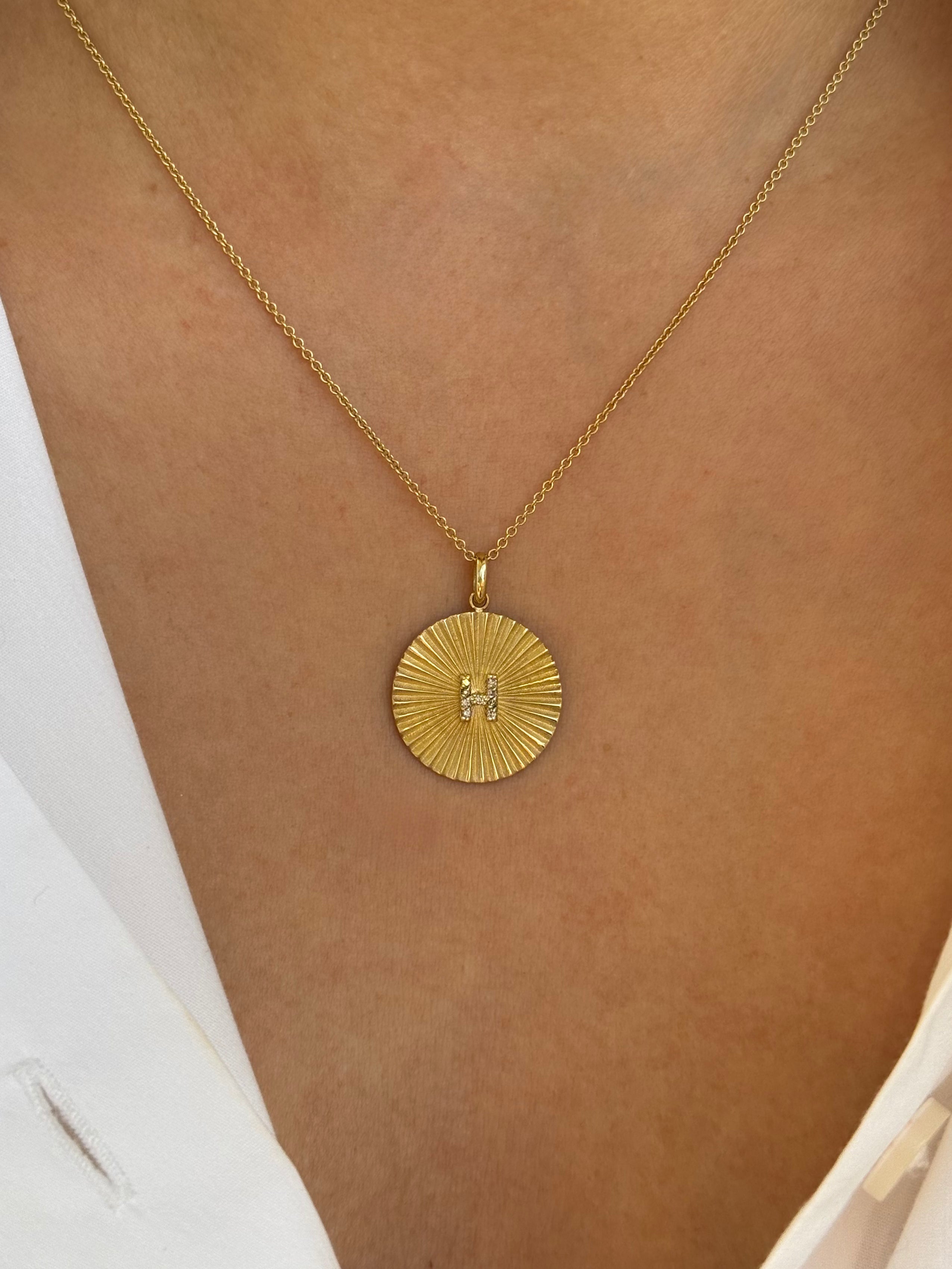 Beautifully handcrafted pleated disc with mini diamond initial H at the center. 14k solid gold, chic and timeless, wear it by itself or layered, day or night.